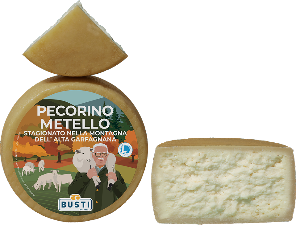 Semi-hard pecorino made from pasteurised sheep's milk and animal rennet, with no lactose. Aged first for 60 days and then moved for 90 days in Metello, a small mountain village nestled in Garfagnana and the hometown of the Busti family, in completely natural microclimatic conditions that contribute to the unique and unmistakable character of this pecorino. The rind is made from chestnut shells from the Tuscan-Emilian Apennines.